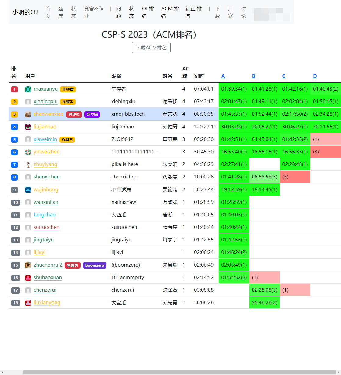 小明的OJ增强脚本 (XMOJ-Script) 在多个方面提供了有益的功能和改进。 首先,通过比赛ACM排名和下载功能,用户可以更方便地浏览比赛的排名情况,并且能够将相关信息下载以备离线查阅,这对于参赛者和观众来说都是一项实用的功能。 界面美化方面,采用新版的Bootstrap样式库、彩色文字和暗色模式等,能够显著提升用户界面的视觉吸引力和舒适度。